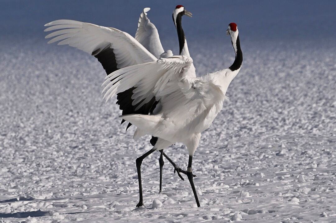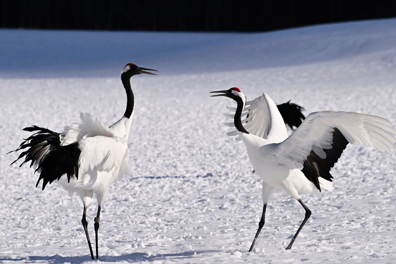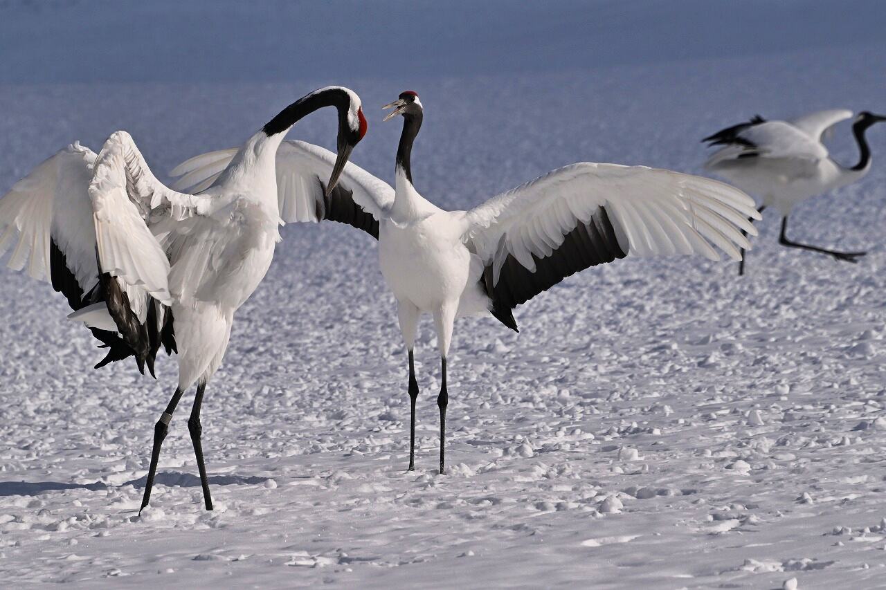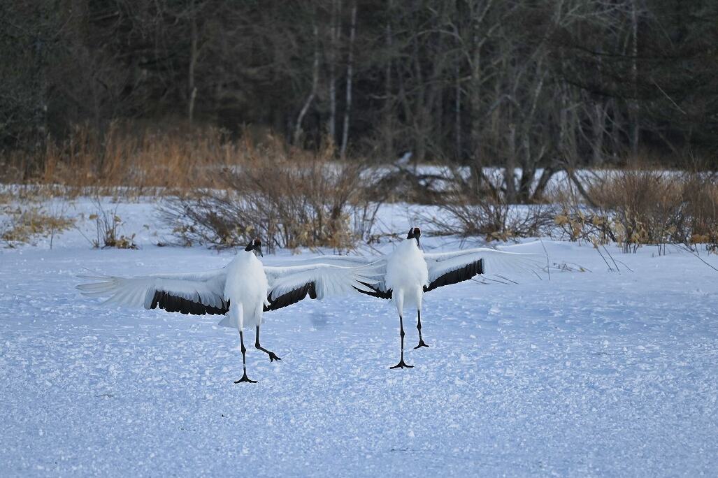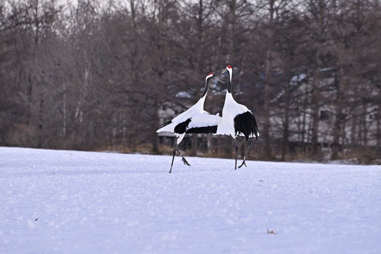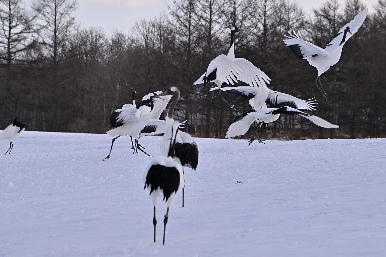 撮影場所では多数(外人も)のカメラマンが撮影してました。2時30分に給餌され、タンチョウツルが次から次へと飛来してきました。オス・メスの2羽が掛け合いオス「オー」メス「カッカッ」と泣きつがいの絆を深め求愛ダンスをして、楽しんでいたようです。