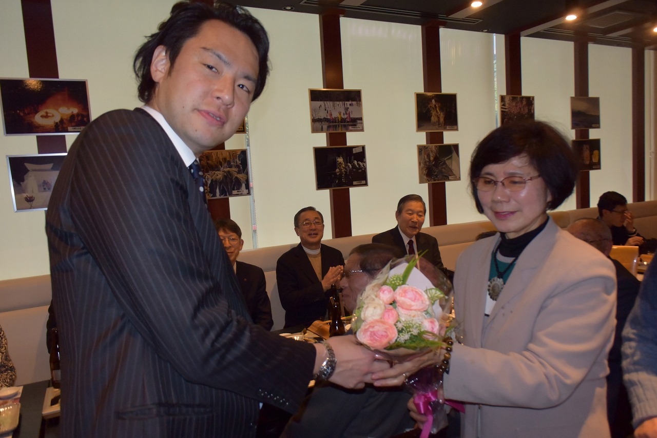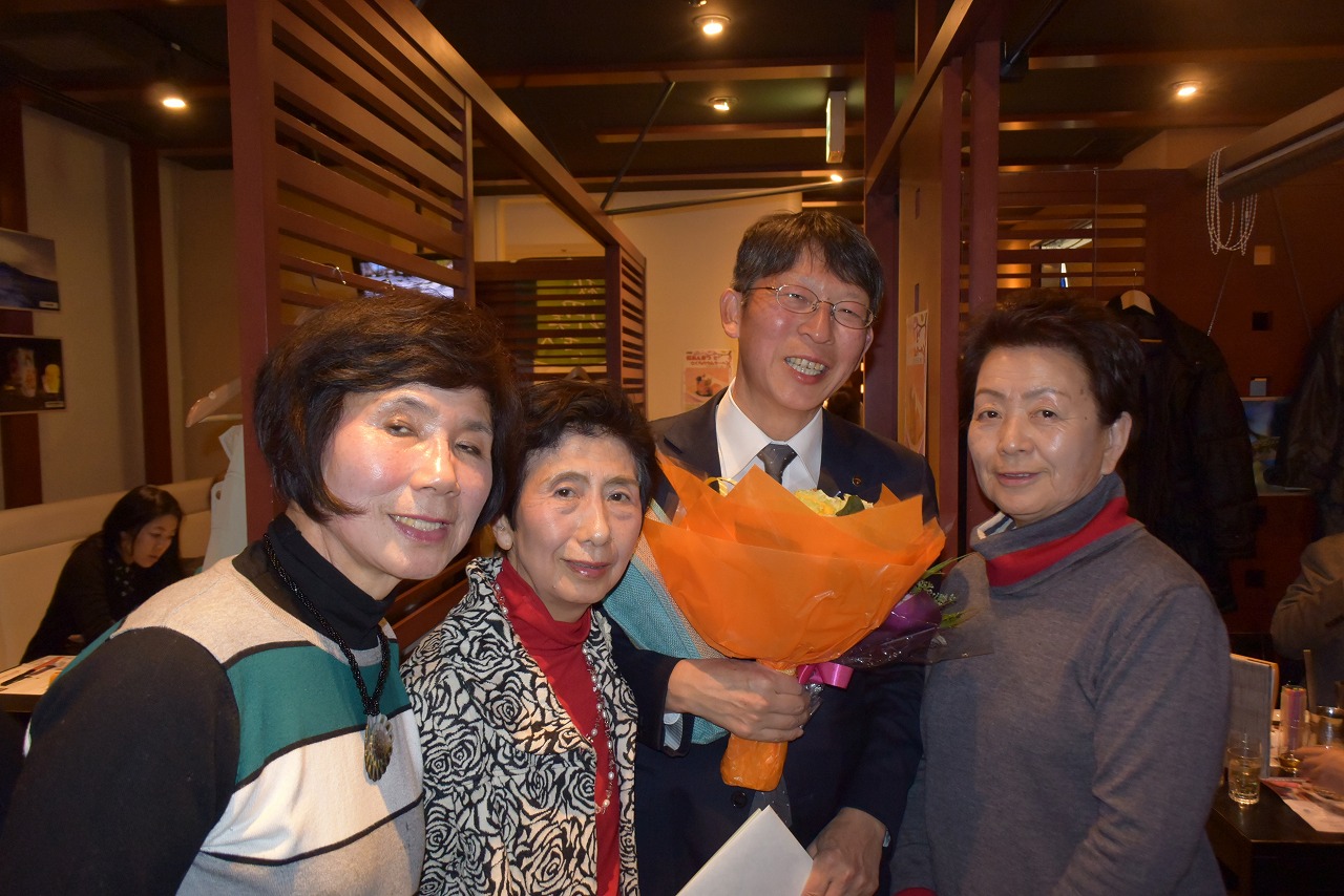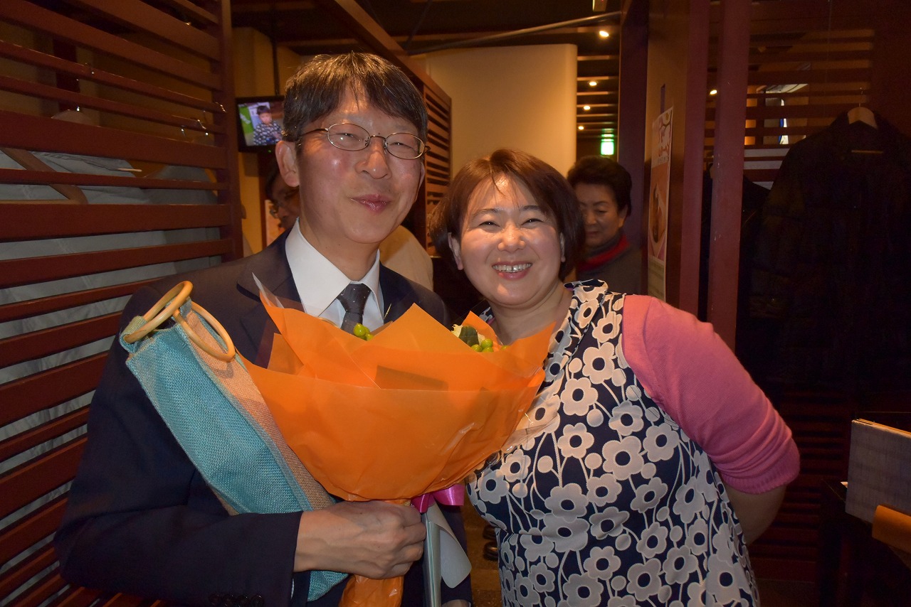 最後のお別れに、女性から花束を贈られ満面の笑顔で、結婚式以来こんなに祝ってもらったことがないと喜んでいました。第二の職場は秋田空港ターミナルビル(株)に勤務(専務取締役)するので空港に来た際に事務所に立ち寄ってくださいとのことでした。