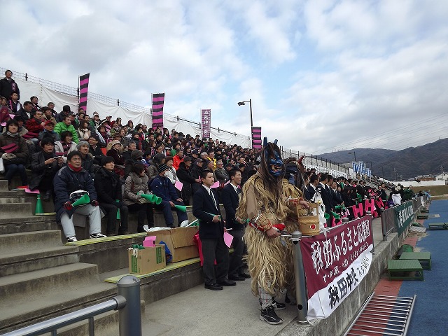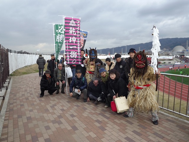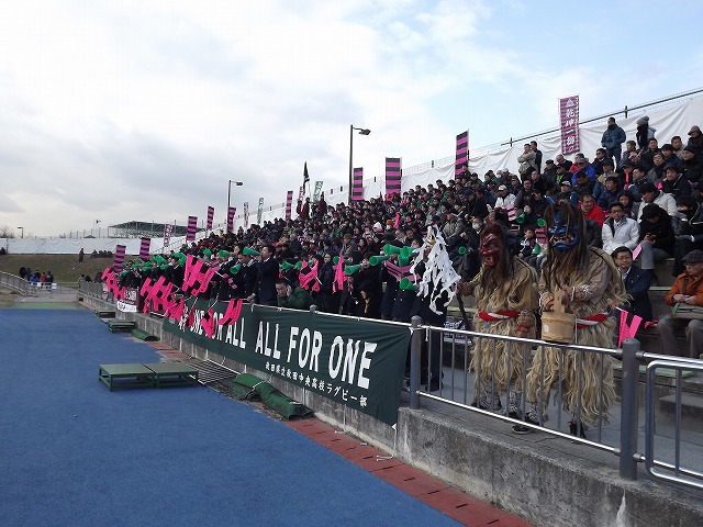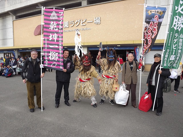 12月28日に、ふるさと応援団(三平・山本・畠山・武内・保坂・5名)として各 学校の垣根を越えて、なまはげと共に、全国高校ラクビー大会花園ラクビー場第三グランドに、秋田中央高校対長崎北陽台高校(長崎)戦を応援してきました。 15対34で敗れましたが、前半5対24、後半14対10と前半の失点を後半盛り返したがエンジンか駆るのが遅かった。最後まで秋田のネバリで頑張りました。