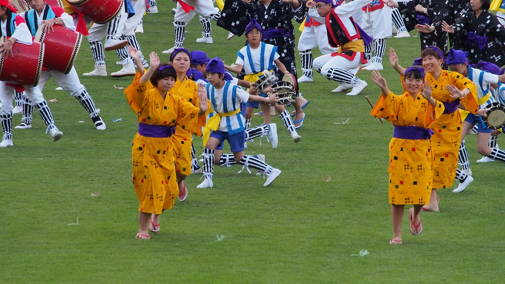 町田市の特別支援学校「町田の丘学園」と卒業生らによるエイサーチーム「町田 遊星」、沖縄の 園田(そんだ)青年会と仲間たちによるエイサー。