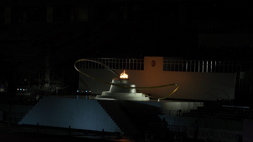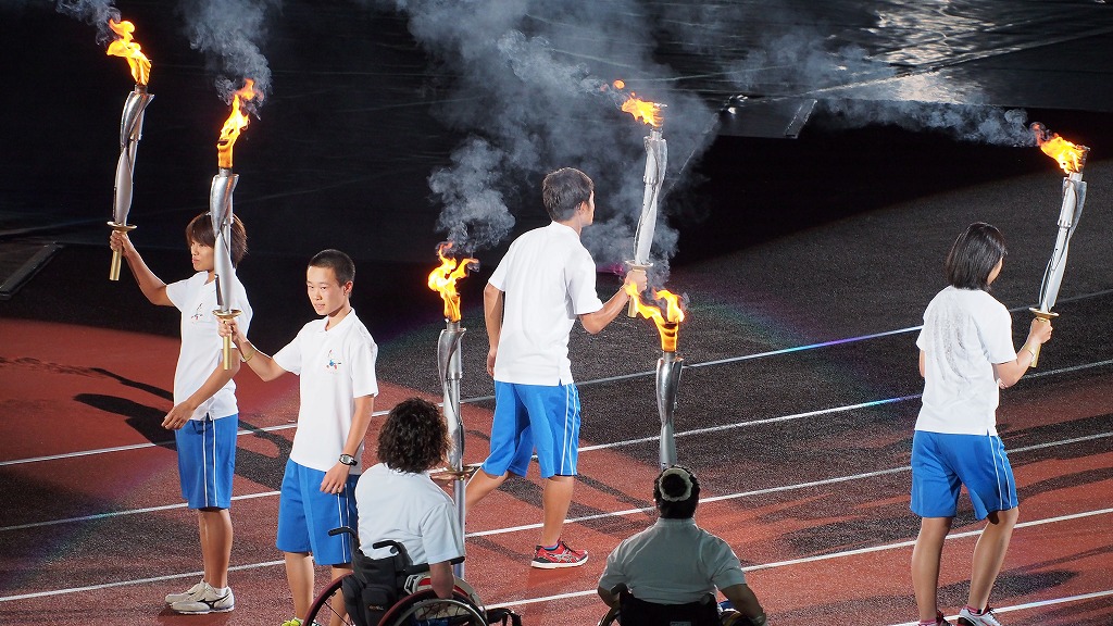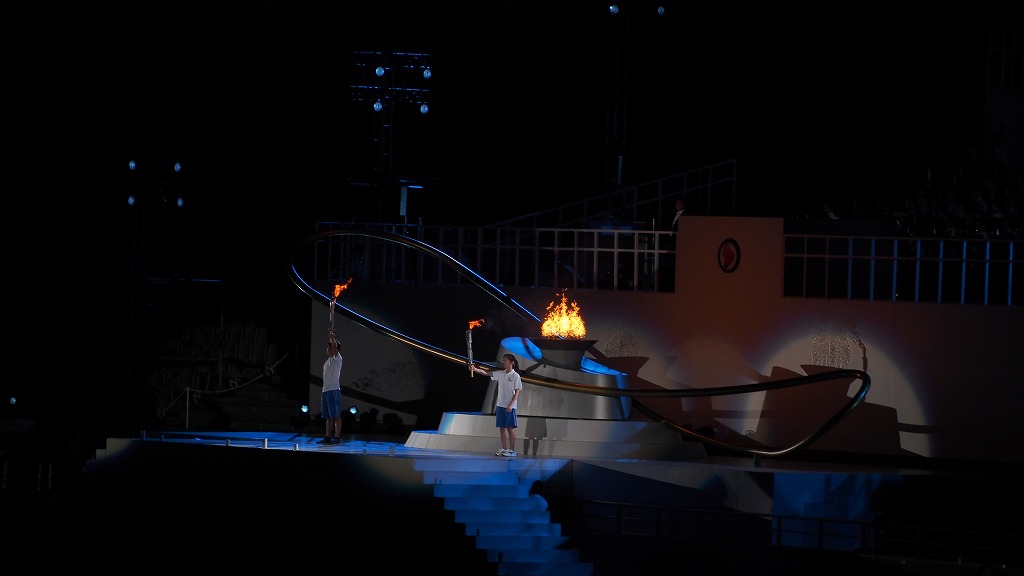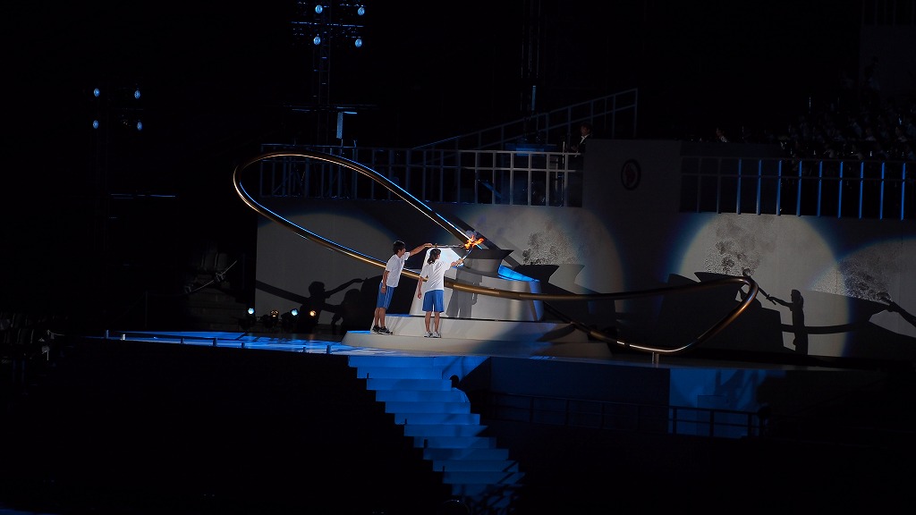 山本修平選手(自転車・高校3年)と、横打美鈴選手(障害者大会陸上)が、炬火台に点火
