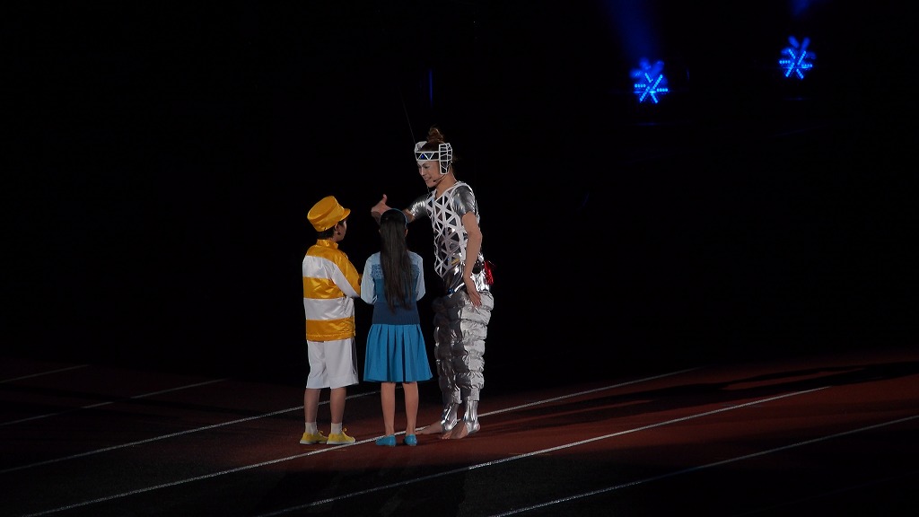 空から舞い降りたポストマンが、スポーツの力が創り出す「誕生」「現在」「未来」を記した手紙を少年と少女に手渡す